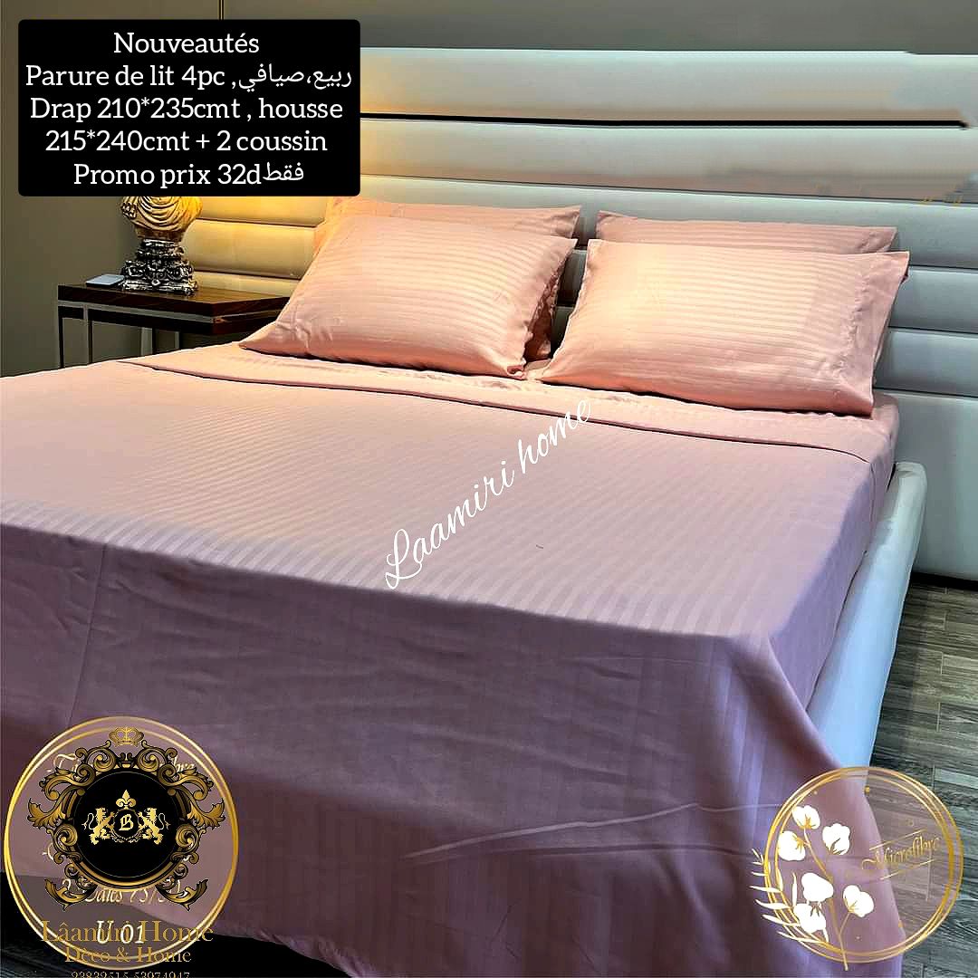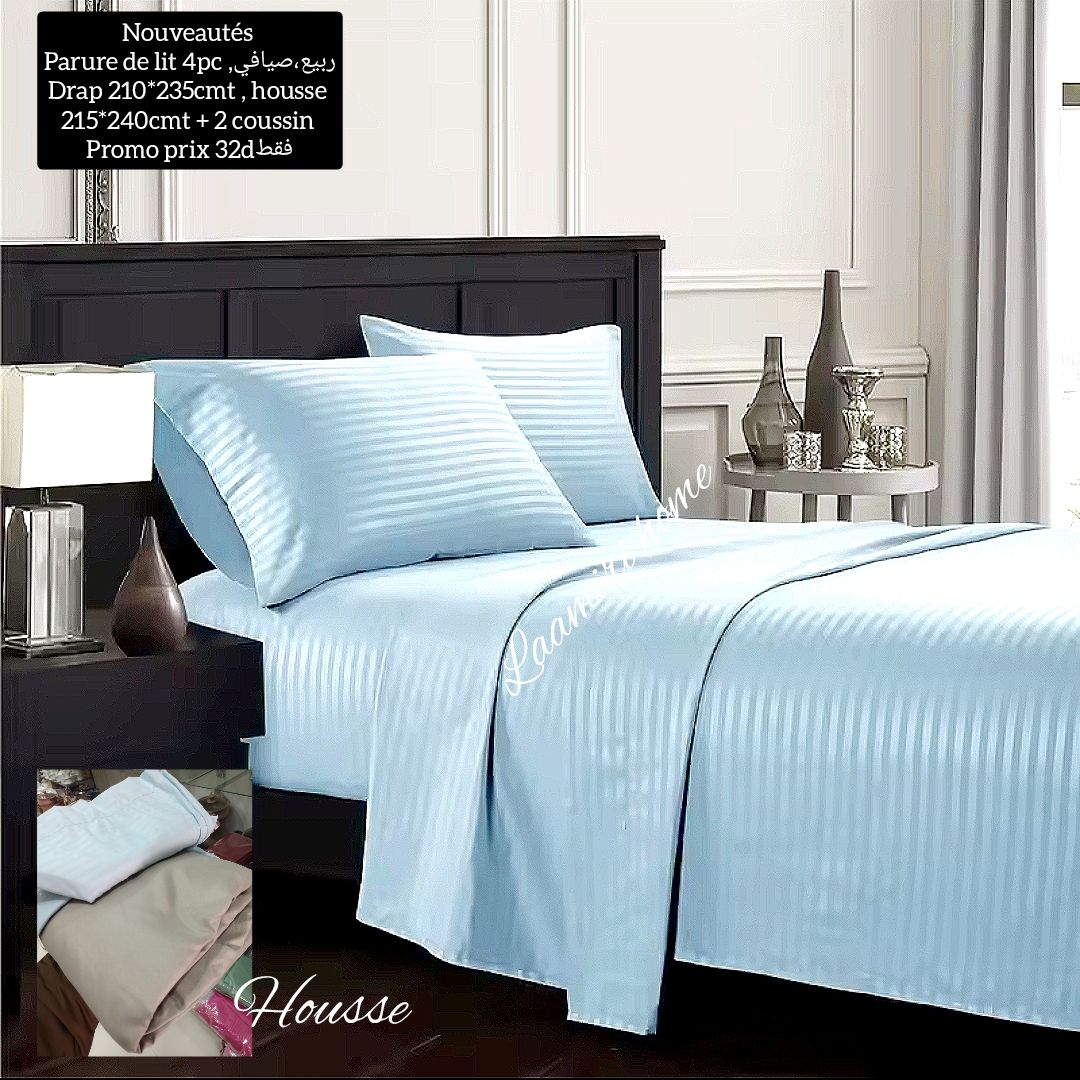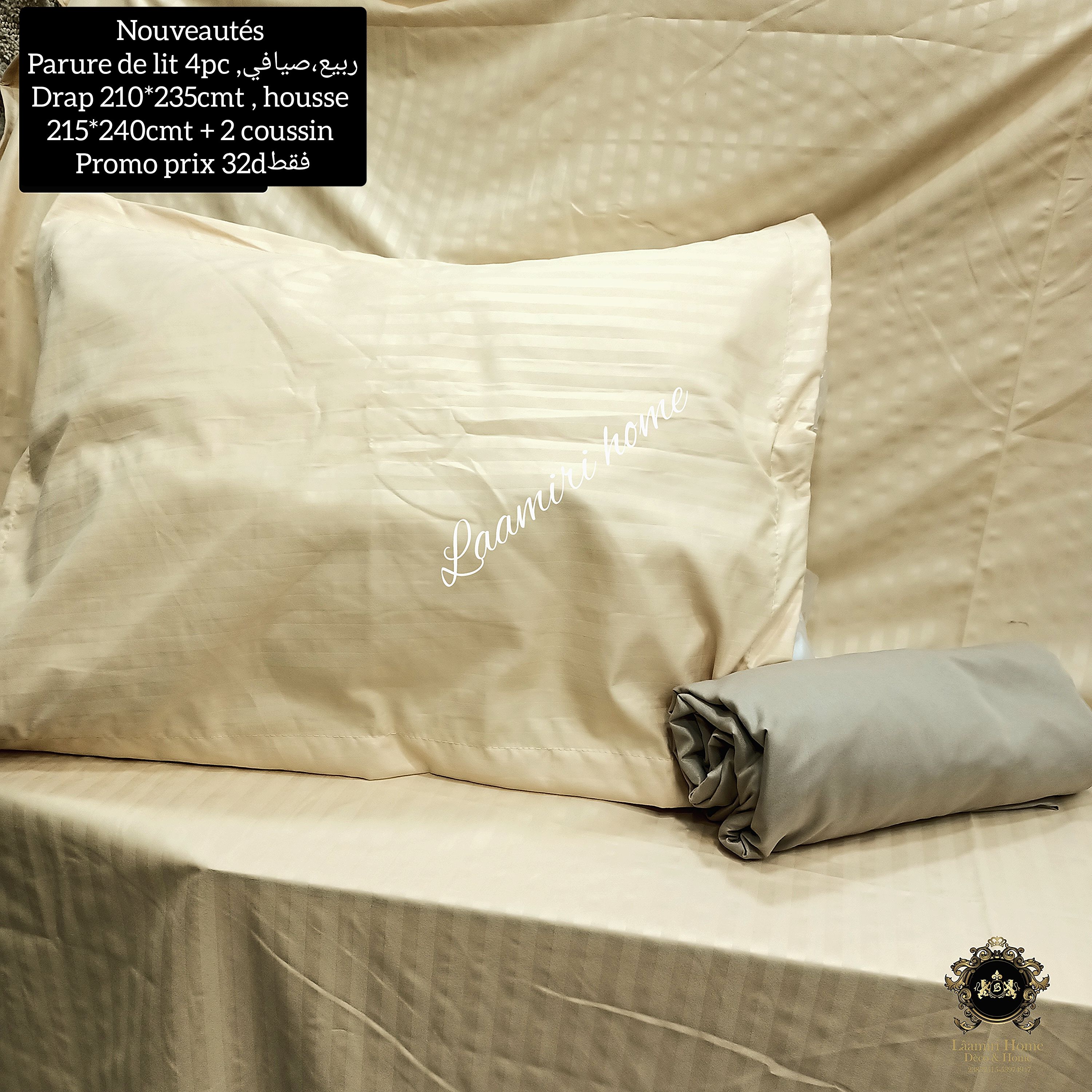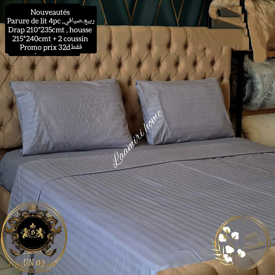 Parure de lit 4 pièces صيافي Drap 210*235cmt , housse 215*240cmt +2 coussin 70/50 qualité 100% cotton 🚛